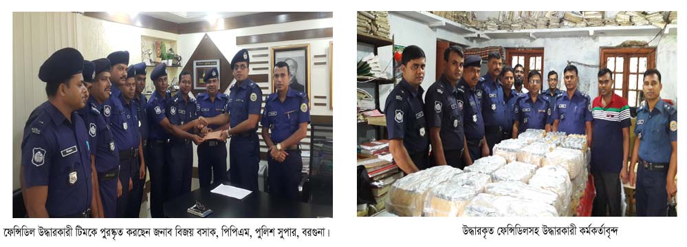বরগুনার আমতলী উপজেলার হলদিয়া ইউনিয়নের উত্তর তক্তাবুনিয়া এলাকা থেকে মঙ্গলবার রাত ৮ টার দিকে হানিফ মুসল্লী ও তার স্ত্রী মাছুমা বেগমকে ১ হাজার ৯ শ বোতল ফেন্সিডিল সহ আটক করে আমতলীর থানা পুলিশ যার আনুমানিক মূল্য প্রায় ১৯ লক্ষ টাকা। আমতলী থানার অফিসার ইনচার্জ (ওসি) মোঃ সহিদ উল্যাহ জানান, “গোপন সংবাদের ভিত্তিতে আমি ঘটনাস্থল থেকে হানিফ মুসুল্লি ও তার স্ত্রীকে ১ হাজার ৯'শ বোতল ফেন্সিডিলসহ হাতে নাতে আটক করি।” এদের বিরুদ্ধে মাদক দ্রব্য আইনে মামলা দায়ের করা হবে বলে তিনি জানান। এ সফলতার স্বীকৃতিস্বরূপ তাৎক্ষণিকভাবে বরগুনা জেলার পুলিশ সুপার জনাব বিজয় বসাক, পিপিএম তাঁর কার্যালয়ে বসে উক্ত টিমকে পুরষ্কৃত করেন। তিনি আশাবাদ ব্যক্ত করে বলেন, “এ ধরণের প্রচেষ্টা অবশ্যই অব্যহত রাখতে হবে এবং বরগুনা জেলাকে যে কোন মূল্যে সাধারণ জনগণের সহযোগিতা নিয়ে মাদকমুক্ত করতে হবে।”